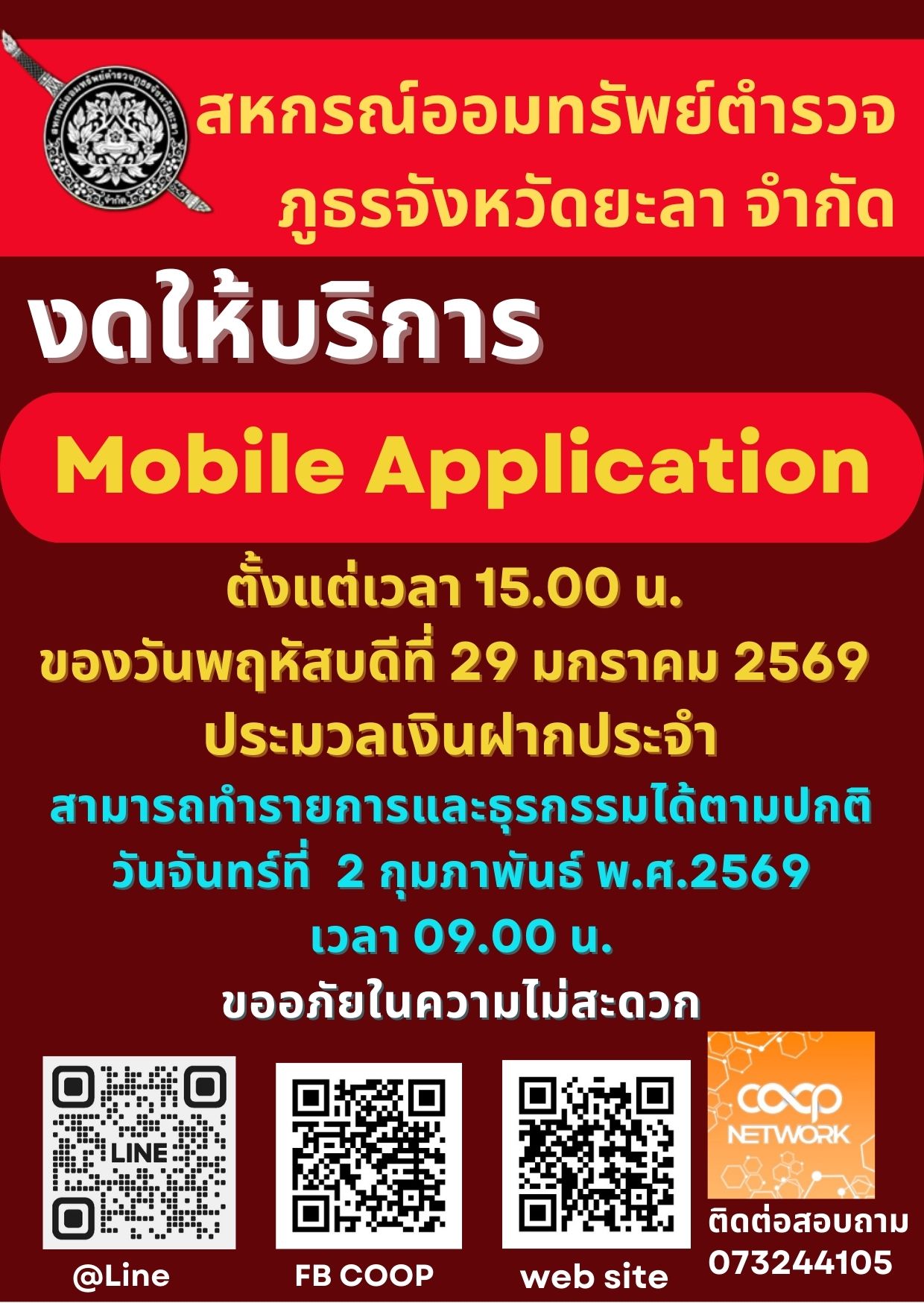 ประกาศ เรื่อง งดให้บริการ Mobile Application วันที่ 29 ม.ค. 69 ตั้งแต่เวลา 15.00 น. และสามารถทำรายการและธุรกรรมได้ตามปกติ วันที่ 2 ก.พ. 69